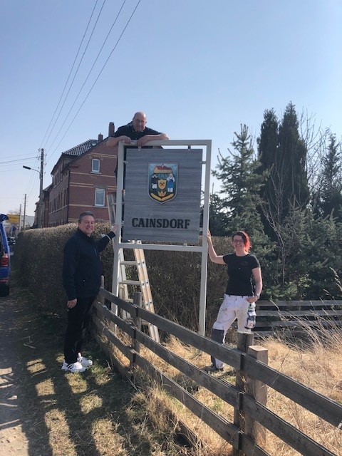 Katrin Pluszczyk, von der Malerfirma Mocker aus Cainsdorf und Volker Kalisch haben es geschafft. Unser erstes Ortseingangsschild ist farblich neugestaltet und aufgewertet worden. Herzlichen Dank für das uneigennützige und engagierte Wirken. Wir Cainsdorfer könnens eben!
